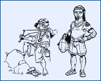 Deux Koirans: Houg et son neveu et fils adoptif, le petit Saryonê. Sous des allures rustiques, Hougourthannirham Yanako, jeune chef de tribu, est un homme cultivé. Sculpteur déjà réputé, il lit et écrit couramment, y compris le hougoudéen d'Émelys, et dispose d'une vaste bibliothèque dans sa maison, dont les ouvrages lui ont été offerts par ses clients. C'est l'un des rares Koirans à avoir une montre. |